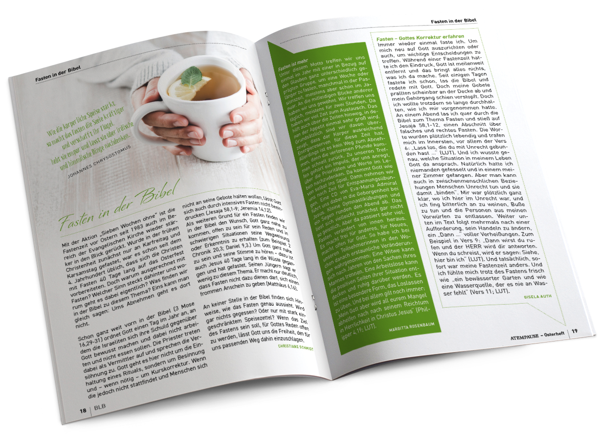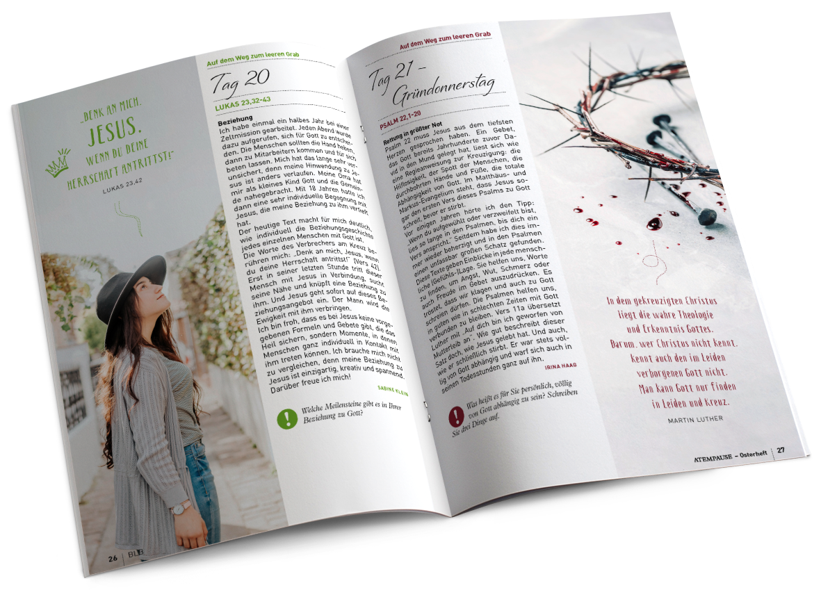 „Bis vor wenigen Tagen habe ich Ihr Atempause Spezialheft Passion und Ostern sehr gerne gelesen und möchte Ihnen jetzt eine positive Rückmeldung geben. Vielen Dank, dass Sie die Leser so anschaulich mit in den Weg Jesu mit Leiden, Kreuz und Auferstehung hineingenommen haben. Das trägt auch im Alltag.“