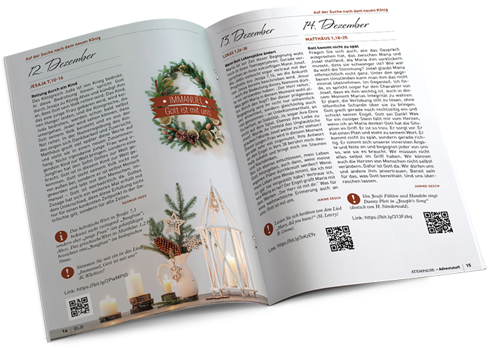 Das Adventsheft der Atempause möchte Sie mit 24 alltagsnah erklärten Bibeltexten, Impulsen zum Nachdenken, Zitaten, stimmungsvollen Liedern und einem Kreativtipp durch die Adventszeit begleiten. Die ansprechend gestalteten Seiten laden Sie auf vielfältige Weise dazu ein, sich auf die Weihnachtszeit einzustimmen.