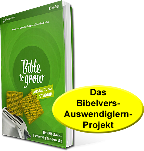 Die drei Bücher Bible to grow bieten ein Konzept zum Auswendiglernen von Bibelversen für Schüler, Studenten/Auszubildende und Erwachsene an. Für das Glaubensleben ist das Auswendiglernen von Bibelversen wichtig. Wer Bibelverse im Kopf mit sich herum trägt, dem wandern sie einfacher ins Herz. Darum geht es bei Bible to Grow: sich Gottes Wort ins Herz zu holen.