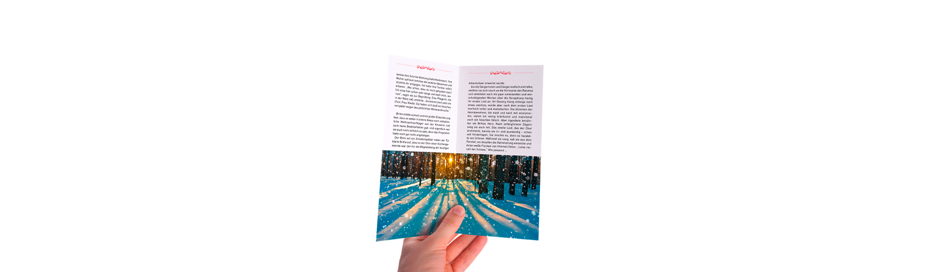 Schicken Sie mit Ihrem Weihnachtsgruß die frohe Botschaft der Bibel an Ihre Freunde und Verwandten: Unsere beliebtenGrußkarten enthalten eine fröhliche oder besinnliche Weihnachtsgeschichte, die zum Nachdenken anregt. Inhalt: Ende der 80er Jahre durchstreift Fred im Kaufhaus die verschiedenen Abteilungen, um ein Geschenk für seine Frau zu finden. Dabei hört er aus den Lautsprechern wundervolle Weihnachtslieder der 50er und würde gern die Musikkassette kaufen. Seine Suche führt ihn zu Herrn Winter, dem Geschäftsführer. Der ist gerade dabei, im Untergeschoss die Einkaufwagen sorgfältig ineinanderzuschieben. So lernt Fred einen ganz besonderen Chef kennen, einen, der nicht nur von oben alles im Blick hat, sondern der auch unten selbst mit anpackt, seine Angestellten kennt und sich um sie sorgt. Geheftet, DIN A6, 10,5 x 14,8 cm,plus Briefhülle und Karte mit Bibelvers: Er, das Wort, wurde ein Mensch, ein wirklicher Mensch von Fleisch und Blut. Er lebte unter uns, und wir sahen seine Macht und Hoheit, die göttliche Hoheit, die ihm der Vater gegeben hat, ihm, seinem einzigen Sohn. Gottes ganze Güte und Treue ist uns in ihm begegnet. (Johannes 1,14)