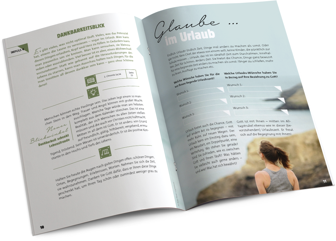 Endlich Urlaub! Endlich Auszeit vom Alltagstrott! Urlaub, das ist Anders-als-sonst-Zeit. Sie bietet uns die Chance, Dinge anders zu machen, als wir es sonst gewohnt sind. Im Urlaub können wir die Dinge tun, die im Alltagstrubel mit all seinen Terminen und Verpflichtungen oft zu kurz kommen: lange ausschlafen, in einem guten Buch versinken, die Natur genießen, Zeit haben zum Reden und Zuhören, ... und vielleicht ja auch Zeit für und mit Gott.