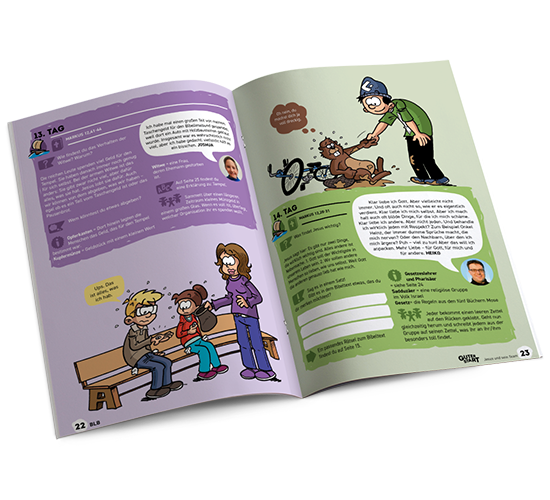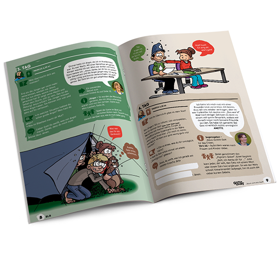 - Der Einstieg ins Bibellesen erfolgt an jedem der 14 Tage über einen bunten Comic-Bildimpuls der neuen Guter Start Figuren.