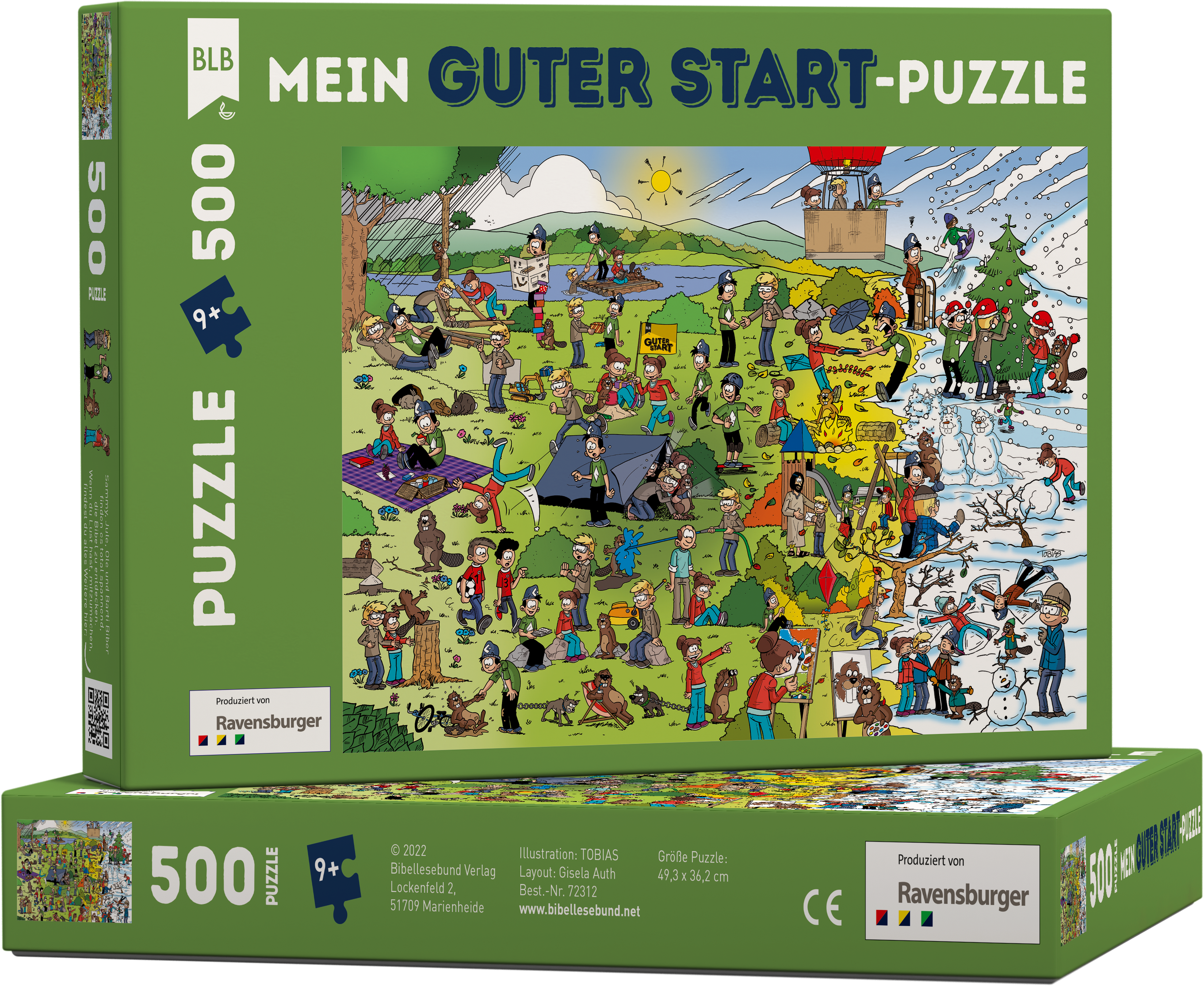 Auf diesem Puzzlebild wimmelt es nur so von Erlebnissen der Freunde Sammy, Jule, Ole und dem Biber Barti. Wer die Bibellese-Zeitschrift Guter Start kennt weiß, dass es den vier Freunden nie langweilig wird und dass sie es super spannend finden, in der Bibel zu forschen. Wer die vier noch nicht kennt, lernt sie mit diesem lustigen Puzzle kennen.