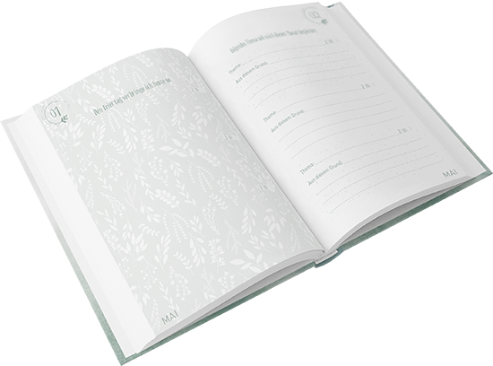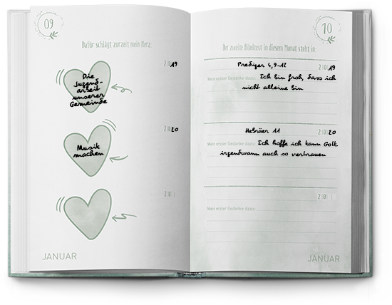 Mit dem liebevoll und hochwertig gestalteten Tagebuch macht es Spaß, jeden Tag ein paar Minuten innezuhalten und einen Gedanken oder eine Idee festzuhalten. Eine Themenübersicht lädt dazu ein, jeden Monat mit einem Thema zu überschreiben und jede Woche mit einer passenden Bibelstelle zu füllen.
