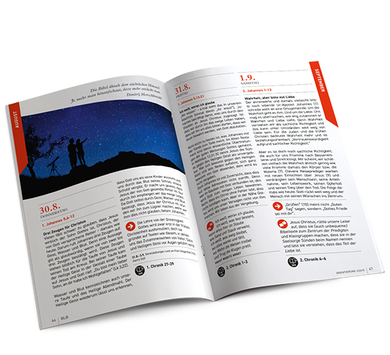 Als Christ im Meinungs-Dschungel nicht die Orientierung verlieren und in den Unwägbarkeiten des Lebens den Mut behalten – dabei möchte die Bibellese-Zeitschrift Orientierung helfen. Sie nimmt die Bibel als Wort Gottes ernst und stärkt das Vertrauen in ihre Zuverlässigkeit. Sie beleuchtet den historischen und kulturellen Hintergrund und erklärt vermeintliche Widersprüche. Doch sie erschöpft sich nicht darin, sondern gibt zugleich konkrete Hinweise, wie die biblische Botschaft gelebt werden kann. Die Mitarbeiterinnen und Mitarbeiter von Orientierung kommen aus unterschiedlichen konfessionellen Hintergründen, doch sie eint der Wunsch, Menschen auf dem Weg des Glaubens voranzubringen.