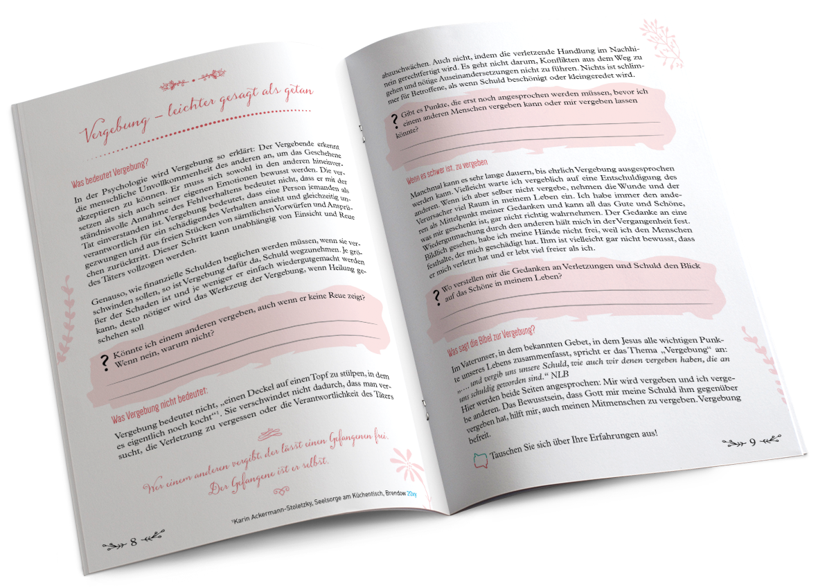 Das Heft mit dem Thema Vergebung will Frauengruppen als Gesprächsgrundlage dienen. Mit vielen Anregungen, der Betrachtung von zwei biblischen Geschichten, und kreativen Impulsen bietet es Material für 2-3 Treffen. Eine Vorbereitungshilfe für die Gruppenleiterin kann kostenlos heruntergeladen werden (siehe oben).